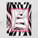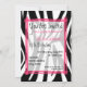 Eine stilvolle Geburtstagseinladung mit einem rosafarbenen Rechteck mit schierem Mittelteil über einem Zebragrundhintergrund auf Vorder- und Rückseite. Vorderseite zeigt eine passende rosa und zebrafarbene Geburtstagstorte mit 4 abgerundeten Off-Center-Ebenen. Top of the cake hat "16" Design. Personalisieren Sie den rosa und schwarzen Text auf der anderen Seite mit Details Ihrer Gelegenheit.