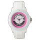 Wild zebra drucken Figur Skaten Uhr in rosa. Eine Figur Skater Silhouette Posen in einem Kreis und es gibt ein "polka-dot" Banner für den Kontrast. Fügen Sie vor der Bestellung Ihren eigenen Namen hinzu! Verwenden Sie zusätzlich den "Anpassen"-Button für weitere Optionen, einschließlich eines anderen Schriftartes! ©gollygirls.com