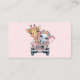 Zwei animierte Tiere: eine Giraffe und ein Elefant. Beide sind mit Blumenkronen auf ihren Köpfen geschmückt. Die Giraffe mit ihrem langen Hals und gepunkteten Muster liegt auf der links Bildseite, während der Elefant mit seinen großen Ohren und seinem Kofferraum auf der rechten Seite liegt. Beide sitzen in einem rosa Fahrzeug, das wie ein Auto aussieht. Im Hintergrund stehen weiche Blätter aus rosa Palmen, die der Szene einen tropischen oder Safari-Flair verleihen.
