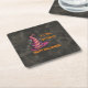 Ein amüsanter quadratischer Untersetzer mit einem schwungvollen rosa und orangefarbenen verzauberten Hexenhut, der auf einem dunkelkohleschwarzen Hintergrund "It's Time for Leckereien, Happy Halloween" steht.