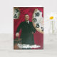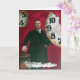 Ein Foto eines Collaged Image von Artyfax. Ein Viktorianischer Geschäftsmann steht wunderbar inmitten einer kaputten Uhr. Versuch er, die Zeit aufzuhalten? Der Hintergrund ist rot Der Text in der Karte ist individuell anpassbar, um Ihre persönliche Nachricht zu ermöglichen