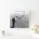 Einfache Anpassung oder Entfernung des Textes auf dieser Wanduhr, die ein Schwarz-Weiß-Bild eines einsamen Fischer stehend auf einem Felsvorsprung am Seneca See in Genf, New York. Der Text des Transcendentalisten Autors, Naturisten und Philosophen Henry David Thoreau lautet: Die Zeit ist nur der Strom, in dem ich a angeln gehe. Er stammt aus Thoreaus berühmtem Buch Walden, das er in Concord, Massachusetts über sein Leben in den Wäldern rund um den Walden Pond schrieb. Es wurde 1854 veröffentlicht.