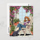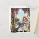 Behalt in Touch mit dieser niedlichen Postkarte. Ein lustiges Comic-Buch, in dem eine Frau auf ihrem Rasen-Stuhl sitzt, mit ihrer Katze, einer Tasse Kaffee oder Tee, umgeben von lila Clematis und hängenden Pflanze.