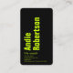Zeitgenössische, minimale Design Visitenkarte mit Ihrem Namen in großen, fetten Buchstaben in Fluoreszenz gelb oder elektrisch Limon auf schwarz.