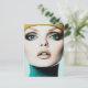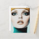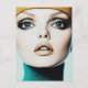 Ein auffallendes nah-up-Portrait eines Modells mit fesselnden aquamarinen Augen, hervorgehoben durch kühnen Augenschminken und vollen, neutralen Lippen. Der Vintage Stil und die farbenfrohen Farben erinnern an das Wesen der 60er Jahre mit einem Hauch moderner Kunst. Ihr intensiver Blick und ihr sanfter Ausdruck erwecken den Reiz und die Raffinesse der Ära.