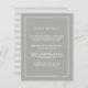 Elegant und einfach, lasse diese kleine Karte in Graubeige-neutral in Greige Ihnen, die wichtigsten Details mit Ihren Hochzeitsgästen zu teilen. Die Karten sind so konzipiert, dass sie mit unserer zeitlosen Hochzeitskollektion übereinstimmen. Sie haben einen weißen geometrischen Rahmen und klassische Serifenschrift. Fragen Sie, welche Informationen auf einer Hochzeitseinladung einfügen? Denken Sie an Details wie Hotelunterkünfte, Gruppennummern, Transport, Anfahrtsbeschreibung, Informationen zum Empfang und Ihre Hochzeitswebsite url. Sie können sogar eine Karte mit der Funktion Anpassen auf die Rückseite hochladen.