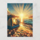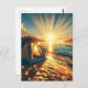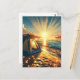 Hübsches Camping mit Postkarte, um Hi zu sagen und in der Touch behalten, mit einer ai-Abbildung eines Zeltes am Strand, wenn die Sonne aufgeht. Ai Illustration in einer hyperrealistischen Comic Buchstil Kunst getan.