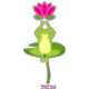 Yoga Frog Meditation während sie auf einem Lilienpolster ausgeglichen sitzt. Niedlicher Frosch mit einer Lotus-Blume oben.