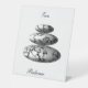 Ein einfaches, sauberes, ästhetisches Zen-Design aus drei glatten, ovalen Steinen, die in einem vertikalen Stapel angeordnet sind, mit dem größten Stein am Boden, einem mittelgroßen Stein in der Mitte und dem kleinsten Stein an der Spitze, was ein Bild von perfekter Zen-Balance schafft.