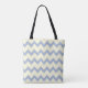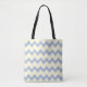 Stilvolle Tasche am Strand mit Zickzack Design in Blau und Weiß.