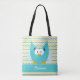 Überall gemusterte Tasche mit Zickzack Streifen in Gelb, Blau und Weiß mit einer blauen Eule und einem Bereich können Sie leicht einen Namen hinzufügen!