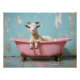 Ein skurriles Gemälde mit einer weißen Ziege, in einer Vintag rosa Badewanne entspannende Hörner, Set an einer hellblauen Wand für eine charmante und spielerische rustikale Szene.