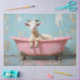 Ein skurriles Gemälde mit einer weißen Ziege, in einer Vintag rosa Badewanne entspannende Hörner, Set an einer hellblauen Wand für eine charmante und spielerische rustikale Szene.