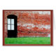 Eine schwarze Tür bricht die Ähnlichkeit einer Ziegelwand und eines Rasens.