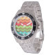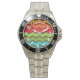 Diese Uhr hat ein Retro-Design aus den 1970er Jahren von horizontalen Zickzacklinien in Gelb, Orange, Rot, Grün und Blau auf einem braunen Feld.