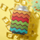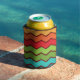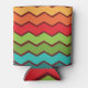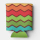 Dieser Dose-Kühler hat in den 1970er Jahren ein Design von Zickzacklinien in Gelb, Orange, Rot, Grün und Blau auf einem braunen Feld.