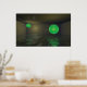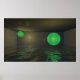3D digitale Kunst eines geschlossenen Raums mit 2 glühenden, mit Wasser gefüllten grünen Kugeln