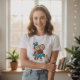 "This sweet and classic cartoon design features two monkeys in a loving embrace, suggesting a flirtatious or affectionate moment. One monkey wears blue overalls and a red shirt, while the other wears a blue polka-dot dress and a large blue bow with a daisy. Both characters have bright, smiling faces and are looking at each other. The style is simple, vibrant, and reminiscent of charming children's animation. This design is versatile for products aimed at couples, children, or anyone who appreciates cute, nostalgic, and wholesome imagery. Imagine it on apparel, greeting cards, sentimental home decor, or gift items."