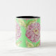 Zinnia Muster auf einer Tasse Kaffee. Beginnen Sie Ihren Morgen mit einem Sprung vom Frühling. Große, helle Zinnia blühen in lila und grün.