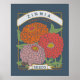 Ein Vintag-modernes Samenpaket mit den fröhlichen Blüten der Zinnia-Blume in warmen Orangen-, Korallen- und Rosatönen. Ein fröhlicher Wandteppich für Ihre Zuhause oder ein charmantes Geschenk für den Gärtner in Ihrem Leben!