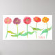 Ein fröhliches Plakat mit fünf Zinnia-Blume in Rot-, Rosa-, Orange- und lila Farben, die mit Aquarell und Touchs von Spatter im Hintergrund für mehr Farbe bemalt sind. In der Sprache der Blume zinnias gemeine Gedanken abwesender Freunde. Fröhliche Wohngestaltung!