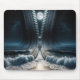 Eine surreale Szene zeigt einen Reißverschluss, der den Ozean unter einem Sternenhimmel trennt, der ein sandiges Ufer und einen Vollmond oberhalb offenbart