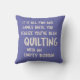Das Kopfkissen ist lila mit einem lustigen Zitat zu werfen, dass alle Quilter sich darauf beziehen können, mit einem leeren Kofferraum zu quiltieren und es nicht zu erkennen, bis es zu spät ist.