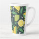 Latte Tasse mit einem niedlichen Muster mit gelben Zitronen und grünen Limonen Früchten mit Stalks von Blätter Set auf einem dunkelgrünen Hintergrund.