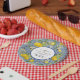 Die Papiertafel "Lemon Floral Citrus Foliage Blue 1. Heilige Kommunion" ist frisch, modern und komfortabel elegant gestaltet. Handgemalte Zitronen und Laubäume in einem mediterran inspirierten Fliesenmuster-Design in einem frischen Sommerblumenthema für diesen besonderen Tag. Copyright, international lizenzierter Künstler und Designer, Audrey Jeanne Roberts, alle Rechte vorbehalten.