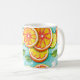 Diese klassische Tasse zeigt ein kühnes und lebendiges Zitrusdesign mit saftigen Scheiben von Orange, Zitrone und Limette, die in einem lebendigen, modernen Stil illustriert sind. Vor einem hellen Türkis-Hintergrund mit spritzerartigen Akzenten und frischen grünen Blättern schafft die Kunst einen energiegeladenen, erfrischenden Look, der jede Küche oder jeden Arbeitsplatz sofort aufhellt. Perfekt für morgendlichen Kaffee, Tee oder gemütliche Abendgetränke, verbindet diese Tasse Alltagstauglichkeit mit einer fröhlichen, auffallenden Ästhetik. Haltbar, glänzend und voller Persönlichkeit bringt sie einen Farbenschub in den Alltag und ist ein unterhaltsames, unvergessliches Geschenk für Früchte-Liebhaber und Fans von aufmunterndem Design.