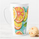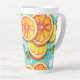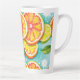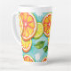 Diese große Latte-Mug zeigt ein lebendiges Zitrusdesign mit saftigen Scheiben von Orange, Zitrone und Limette, illustriert in einem lebhaften, modernen Stil. Vor einem hellen Türkis-Hintergrund mit dynamischen Spritzern und frischen grünen Blättern schafft die Kunst einen anregenden, erfrischenden Look, der jeden Morgenritual aufhellt. Mit ihrer hohen, eleganten Form und großzügigen Kapazität ist diese Tasse perfekt für Latte, Cappuccino, Tee, Kakao oder gemütliche Abendgetränke. Haltbar, glänzend und voller Persönlichkeit bringt sie einen Farbklecks in den Alltag und ist ein fröhliches, unvergessliches Geschenk für Früchte-Liebhaber und Fans von aufmunterndem Design.