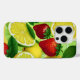 Eine lebendige iPhone-Hülle mit hellen Zitronen, Limonen und Erdbeeren in einem frischen botanischen Stil auf grünem Hintergrund. Die fröhliche Sommerpalette verleiht alltäglicher Technik einen lebendigen, aufmunternden Touch und bietet Frauen, die fruchtige Motive, farbenfrohes Zubehör und Geschenke fürs Handy lieben, ein stylisches Accessoire.