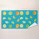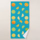 Dieses Badetuch-Set mit Limetten, Zitronen und Orangen auf aquamarinem, blauen Hintergrund.