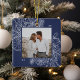 Ein modernes und elegantes Urlaubsornament, das Ihr liebstes quadratisches Foto in einem schön detaillierten Rahmen mit Kiefernbäumen, Blätter, Sternanis und Zitrusschnitzen auf einem marineblauen Hintergrund umrahmt. Personalisieren Sie die Rückseite dieses einzigartigen Weihnachtsschmucks mit Ihrem Familiennamen.