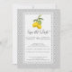 Fügen Sie Ihre eigenen Verlobung Foto und Details zu einem von einer Art Save the Date, die von Freunden und Familie für immer geschätzt werden! Handgemalte Zitronen, Zitronenblüten und Zitrusblumengrün kombiniert mit einem zarten grau-weißen Diamantenmuster für ein modernes, grau-weiß-gelbes Hochzeitstil. Hergestellt von Audrey Jeanne Roberts, international anerkannter Künstlerin und Designerin, Urheberrecht.