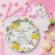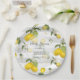 "Zitronenzitrus Blumenblättern Weiß auf grauem Streifen Papierplatte für Ihre Babydusche." Originale Kunstwerke, die von international lizenzierter Künstlerin und Designerin, Audrey Jeanne Roberts, gemalt wurden.