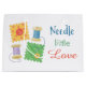 Hobby-Illustration des Nähhandwerks: ein paar Stoffpatches, Tasten, eine Nadel und zwei Fäden. Das Zitat auf der anderen Seite der Tasse lautet: Nadeln kleine Liebe.