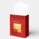 Rotes Ox-Papier-Schnitt (gedrucktes Bild) auf der Ecke eines goldenen Quadrats + 12 zodiaktische Zeichen + Yin Yang Symbol mit Gruß in Englisch in der oberen (Goldschrift und Tropfschatten nicht anpassbar). Design auf Zelt Gefallen Box mit Grüße in Chinesisch. Erhältlich mit anderen Designs und in anderen Stilen (Gable, Classic Würfel..) und Wein Geschenkbox. Passende quadratische und rechteckige Einladungen, Grußkarte, Postkarte, Handwerksbedarf und mehr... Perfekt für das chinesische Neujahr des OX 2021.