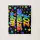 Vibrierende This, lively, birthday-themed jigsaw puzzle design has the message "HAPPY BIRTHDAY, ZOE" with the characters having a colorful rainbow spectrum inspirred gradient pattern, in Addition to a fun field of stars background pattern. An exciting puzzle like this might be a fun way to send birthday wishes to somebody named Zoe. [~ Z0000468]