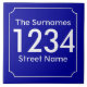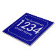 Gemustert nach französischen Straßenschildern und Adressnummern. Schmale weiße Grenze mit umgekehrten Kreisfilets an den Ecken. Dunkelblauer Hintergrund Keramik-Nummernfliesen. Sie passen sich die Nummern oder Buchstaben an, die Sie für Ihre Keramik-Fliesen oder Mosaik-Zeichen benötigen. Zahlenschilder für Wetterbeweise, Hausnummern