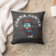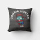 Ein makabre Kissen mit einem cool aussehenden Zombie, mit gerippter und zertäterter Kleidung mit ausgestreckten Armen auf der Suche nach Kleidern. Große freie Augen mit krank grün verrottender Haut. Blut Spritzer hinter seinem Kopf. Text sagt Zombie Jäger, in kurviger Schrift. Set auf kohlegrauem Hintergrund.