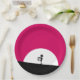 Papier Teller mit einem coolen Zombie-Typ. Rosa und schwarz fett und lebendig. Eine Zombie-Silhouette mit ausgestreckten Armen auf der Hirnjagd. Ein großer weißer Mond leuchtet von hinten.