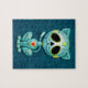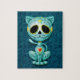 Dieser entzückende blaue Kätzchenentwurf wird mit empfindlichem Wirbel und Punktmustern verziert. Gelbe Blume elt Kreis die reinen schwarzen Augen in der Tradition des Tages der toten Zuckerschädel rad. Die Katze sitzt sich hin und vorwärts schaut mit seinem Schwanz, der in den Hintergrund wellenartig bewegt. Der übergroße Kopf sitzt auf einem kleinen Körper, der playful schafft, Cartoon wie Auftritt. Ein Stern mit fünf Punkten sitzt mitten in der Stirn des Kätzchens, während ein helles rotes und gelbes Herz in der Mitte des Kastens erscheint. Ein Schatten fällt auf den tiefen blauen Hintergrund, der den Entwurf macht, scheinen, gerade über die Oberfläche dieses Puzzlespiels zu schwimmen. Die niedliche kleine Katze ist ein Spaß und ein stilvoller Entwurf, die durch die schönen Muster des Tages der toten Zuckerschädel inspiriert werden.