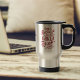 Personalisierter Thermalreisekrug mit Ihrem Namen und ein Kaffeeliebhaber zitieren in dekorativer Typografie. Das Zitat lautet "weil es zu früh für Wein ist" und wird auf beiden Seiten gedruckt.