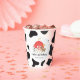 niedliche Geburtstagsparty-Tassen von Nutztieren mit Kuhdruck. Oink Moo Cock-a-doodle doo