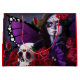 Eine Fee in einem Zuckerschädel-Tag des Totenschminks, ganz lila von rote Rosen und Schädel umgeben