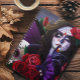 Eine Fee in einem Zuckerschädel-Tag des Totenschminks, ganz lila von rote Rosen und Schädel umgeben