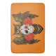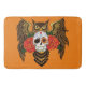 Eine braune große Hornkeule mit einem Tag des toten Zuckerschädels und rote Rosen in einem Hintergrund von Orange.