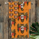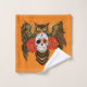 Eine braune große Hornkeule mit einem Tag des toten Zuckerschädels und rote Rosen in einem orangefarbenen Hintergrund