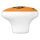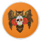 Eine braune große Hornkeule mit einem Tag des toten Zuckerschädels und rote Rosen in einem orangefarbenen Hintergrund